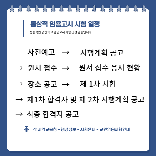 2023 임용고시 일정이 사전 예고(공립 중등 임용고시 사전예고) 될 때는 중등 임용고시 일정이 정확하게 담긴 시행계획 공고일, 원서접수 기간, 제1차 시험일이 안내됩니다. 제2차 시험 및 기타 세부 일정은 시험 시행계획 공고 시 함께 안내됩니다. 그리고 2차 시험의 정확한 일정은 보통 1차 시험 합격자 발표 시 함께 공고되는 경우가 많습니다.