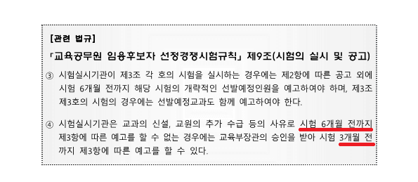 교육공무원 임용후보자 선정 경쟁시험규칙 제 9조 3항에 따라 시험 6개월 전까지 시험의 개략적인 선발 예정 인원, 즉 티오와 선발 예정 교과도 함께 예고하여야 합니다. 하지만 특별한 사유가 있어 시험 6개월 전까지 예고가 힘든 경우에는 교육부 장관의 승인 하에 시험 3개월 전까지 예고할 수 있습니다. 하지만 최근에는 6개월 전 사전 티오 및 임용고시 일정 발표는 유명무실한 것이 되어버리고 말았습니다. 2023 임용고시 일정 또한 예외가 아닙니다.
