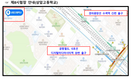 중등 특수교사 임용고시, 조리, 물리 과목 시험이 이루어지는 8시험장은 마포구입니다. 서울 마포구 월드컵북로 445 상암고등학교는 공항철도 6호선 디지털미디어시티역 6번 출구로 나오면 됩니다. 경의중앙선 수색역 1번 출구로 나와도 됩니다. 도보 거리가 꽤 됩니다. 25~30분 예상해야 합니다.