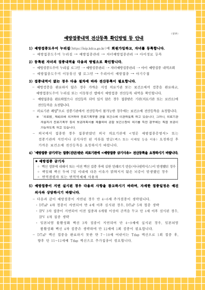 취학통지서와 함께 예방 접종 관련 안내가 이루어집니다. 아이들이 공식적인 의무 교육기관에 들어와 단체 생활을 하게 되다 보니 예방 접종을 하라는 안내입니다. 요즘은 예방접종 도우미 홈페이지에서 예방접종 여부를 확인할 수 있습니다. 그리고 전산등록이 되어 있다면 취학 예정 학교로 자동으로 정보가 넘어가 건강기록부에 기재됩니다. 입학 전까지 예방접종을 완료하지 않은 부분만 접종을 완료하시면 따로 학교에 제출할 내용은 없습니다.
