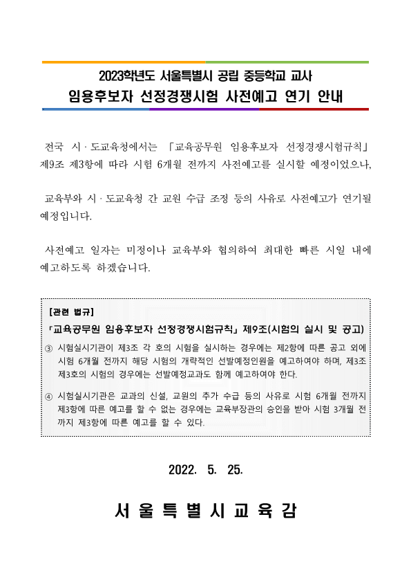 위의 사진은 서울특별시교육청의 사전예고 연기 안내입니다만 전국 교육청, 다른 지역교육청도 동일한 공고문이 올라왔습니다. 공고문의 내용은 교육부와 시도교육청 간 교원 수급 조정 등을 사유로 사전예고가 연기되었다는 것이 주요 내용입니다.
